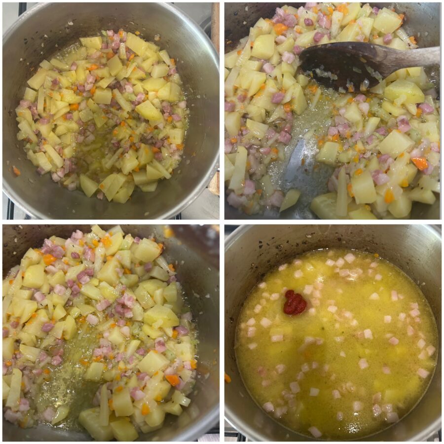 Remuez constamment à feu vif et lorsque les pommes de terre commencent à accrocher au fond de la casserole, versez un litre d’eau, ajoutez le concentré de tomate et portez à ébullition.