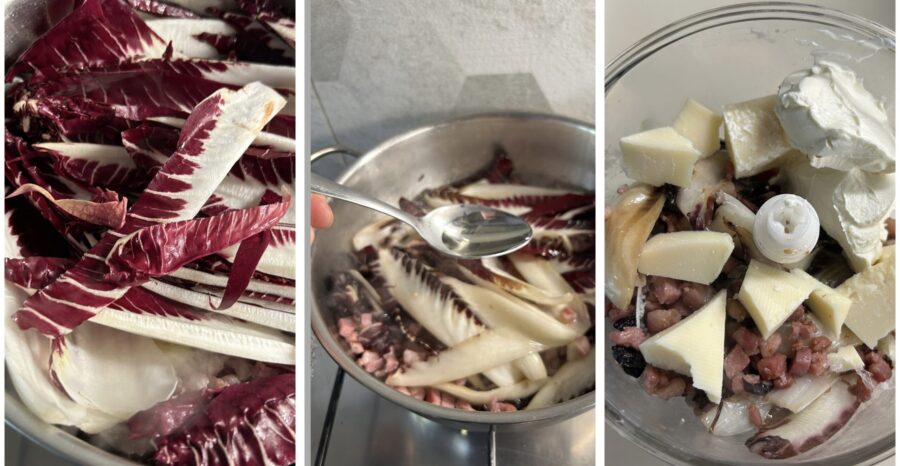 Ajoutez les feuilles de radicchio et, dès qu’elles commencent à flétrir, versez le vinaigre : cela évitera qu’elles noircissent trop. Faites ramollir les feuilles, quelques minutes suffisent ; rassemblez le tout dans le bol du mixeur avec la ricotta et le parmesan, mixez jusqu’à obtenir une crème homogène, en versant un peu d’huile (ou de l’eau de cuisson des pâtes si vous souhaitez assaisonner vos pâtes avec le pesto) si elle est trop compacte.