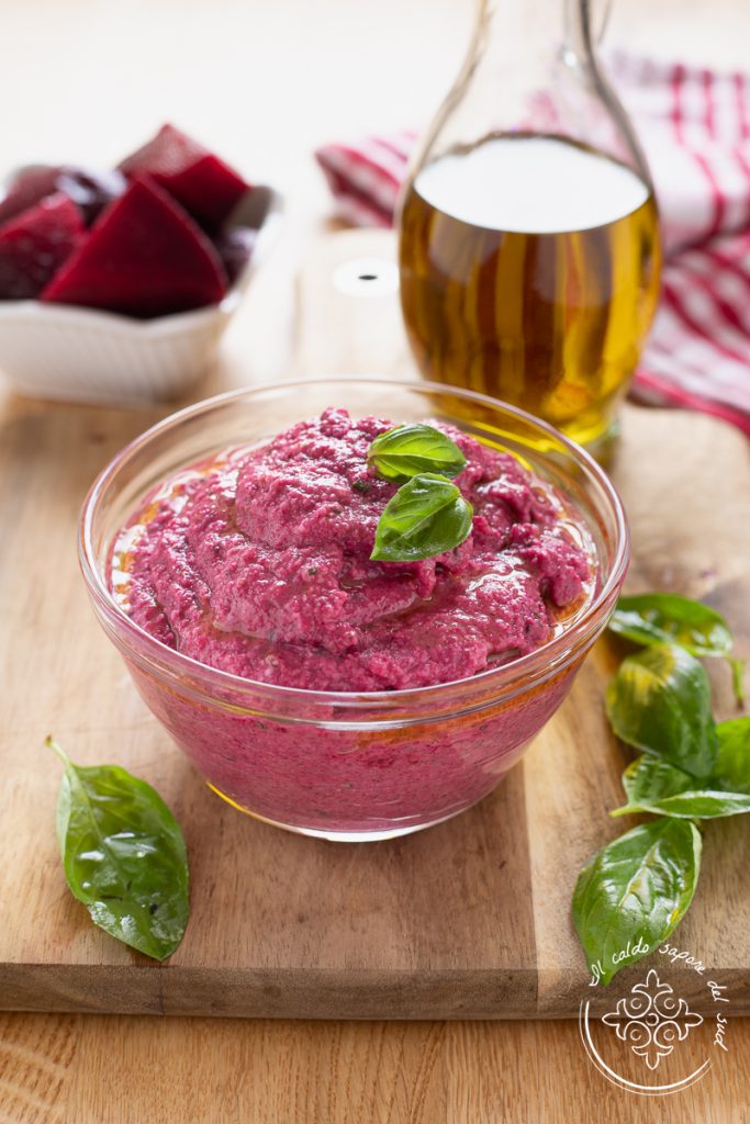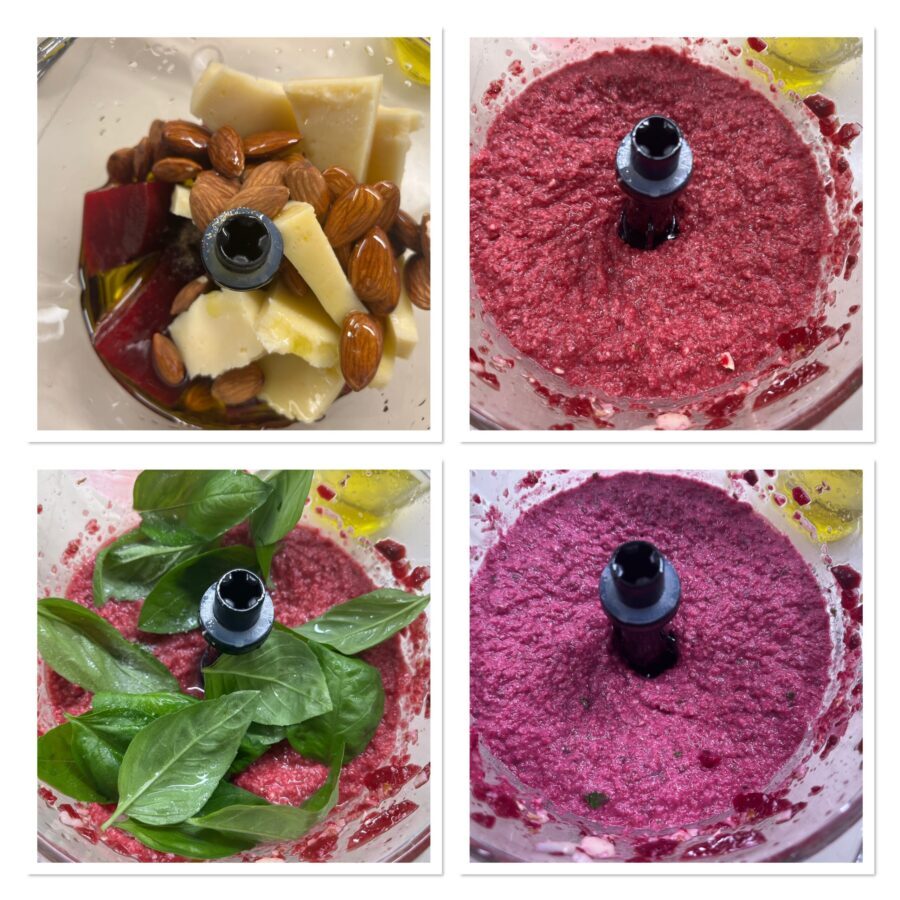 Généralement les betteraves précuites sont emballées en sachets sous vide de 500 g, donc comme pour préparer ce pesto il vous faudra à peu près une petite betterave, vous pourrez utiliser les autres tranchées et assaisonnées d’huile et de vinaigre, de préférence balsamique, pour un simple accompagnement.