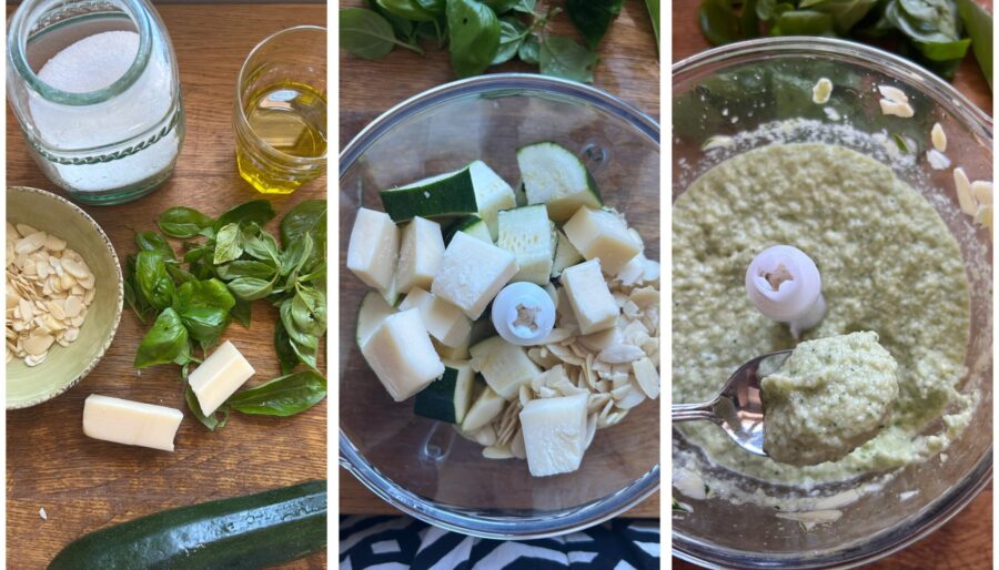 Préparation du pesto de courgettes crues