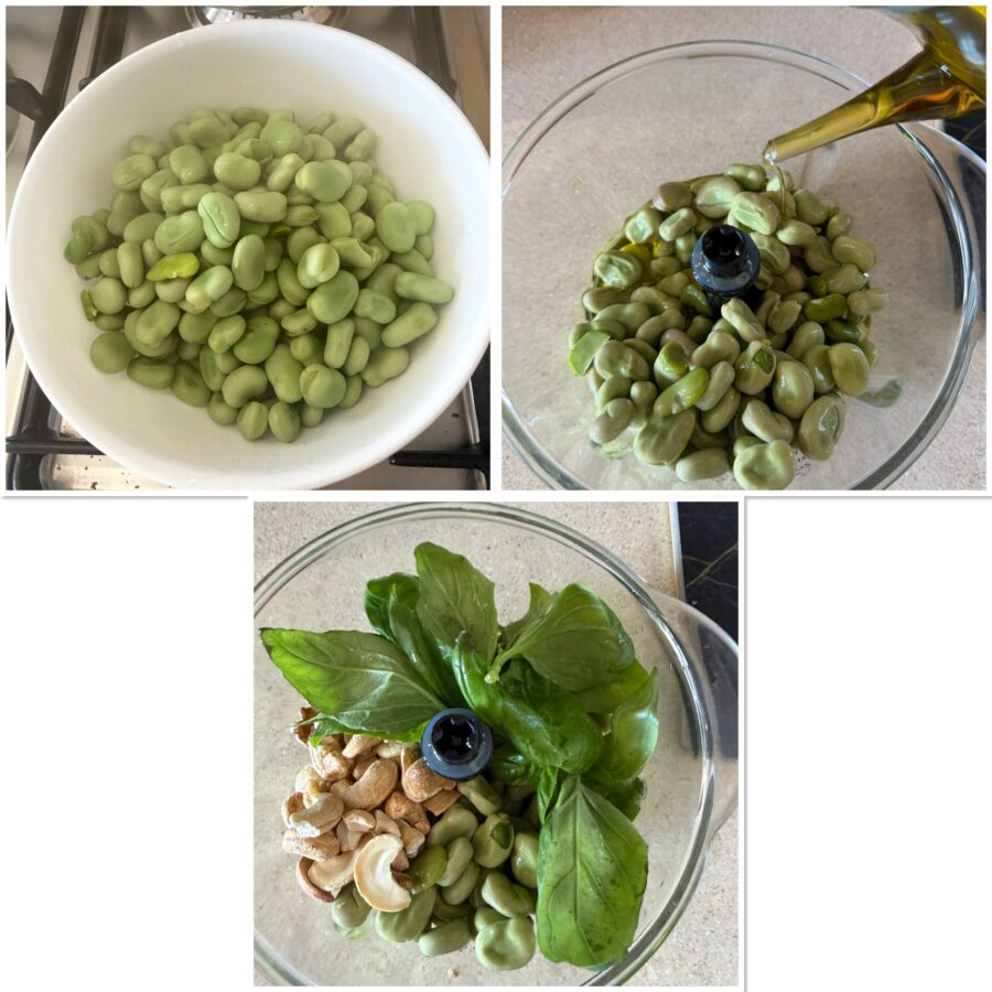 Mettez les fèves nettoyées dans le mixeur, ajoutez l’huile d’olive extra vierge, le basilic frais, les fruits à coque (comme les noix de cajou ou les amandes), le parmesan, le pecorino et l’ail.