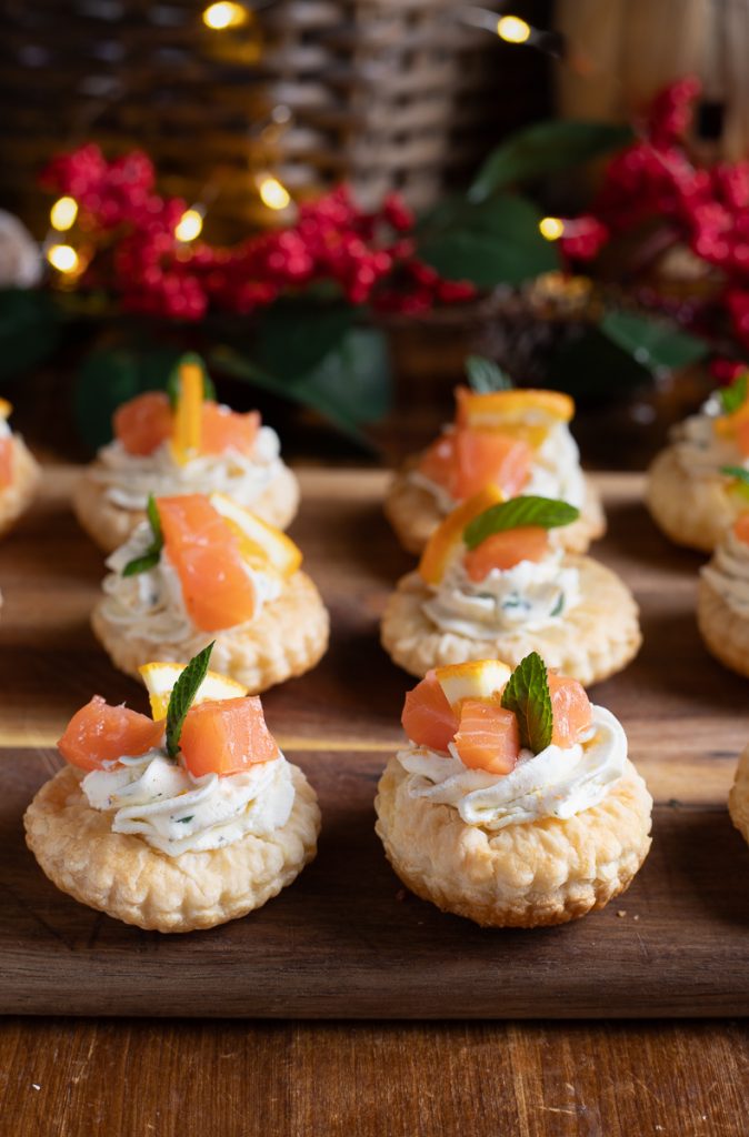 Coupez le saumon en petits morceaux ; du saumon fumé en pavés serait plus spectaculaire. Répartissez-le sur les différents feuilletés et garnissez de fines rondelles d’orange et de feuilles de menthe.
