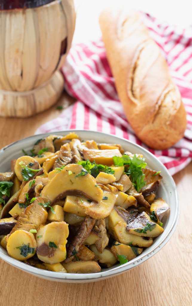 Pleurotes cardoncelli sautés à la poêle au safran, une recette simple et rapide pour un accompagnement savoureux et léger. Idéaux pour accompagner des plats secondaires de viande, des plus simples aux plus riches, bons à déguster comme entrée végétarienne et vegan, parfaits sur des bruschettas seuls ou avec du fromage fondant, excellents avec des pâtes, les pleurotes cardoncelli sautés sont vraiment délicieux. De texture charnue, les cardoncelli rendent peu d’eau à la cuisson et ont un très bon rendement, ils sont faciles à nettoyer et se préparent rapidement. On peut cueillir les cardoncelli dans la nature, ils sont délicieux et dans ma région on les connaît comme funghi di « ferla », mais on peut aussi les acheter au supermarché ou chez le primeur et même les cultiver à la maison en achetant des ballots contenant le mycélium, comme je l’ai fait. Aujourd’hui en effet j’ai réalisé ma seconde récolte de pleurotes cardoncelli cultivés à la maison, en en récoltant pas mal. Avec une partie j’ai préparé un risotto, une partie je les ai congelés et avec la dernière partie j’ai réalisé un classique de la cuisine paysanne : les champignons sautés. Avec cet accompagnement rapide j’ai servi des escalopes de dinde au four et en très peu de temps j’ai mis le dîner sur la table. Allons en cuisine maintenant, je vous raconte comment j’ai cuisiné mes pleurotes cardoncelli cultivés à la maison, vous verrez que vous allez adorer cette recette, que j’ai rendue encore plus gourmande en ajoutant du safran. Avant de nous retrousser les manches je vous rappelle que si vous voulez rester informé de toutes mes recettes vous pouvez suivre ma page Facebook (ici) et mon profil Instagram (ici).