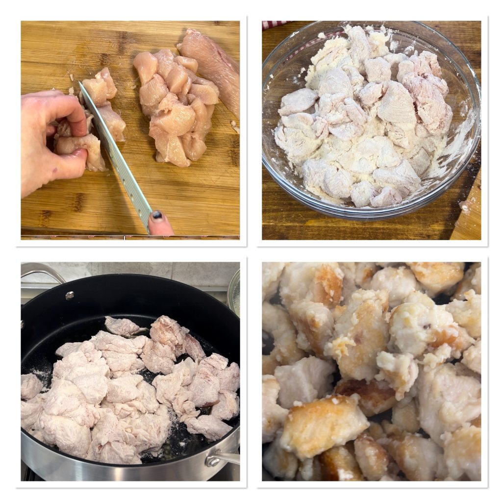 Pour préparer le blanc de poulet aux oignons et aux tomates séchées, choisissez une poitrine de poulet entière : elle revient un peu moins cher et vous pourrez gérer la taille des morceaux. Enlevez les os et le cartilage puis coupez-la en morceaux. Passez tous les morceaux dans la farine et faites en sorte qu’elle adhère bien. Versez un généreux filet d’huile dans une poêle à fond épais et laissez dorer le poulet à feu vif. À la fin, une croûte dorée doit se former à la surface des morceaux : retournez-les de temps en temps et en environ 10 minutes tout devrait être prêt.