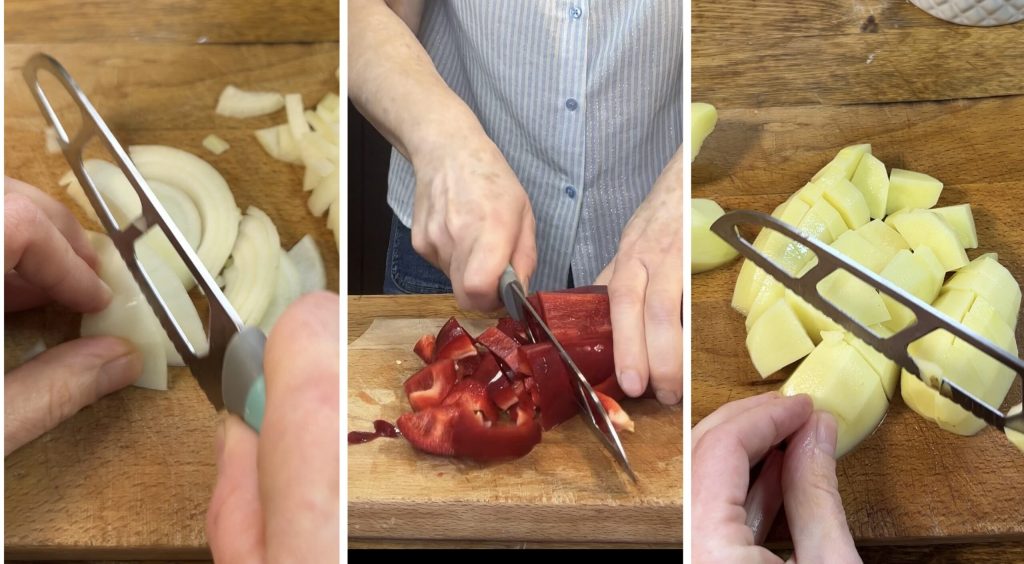 Pour préparer la poitrine de poulet au four avec poivrons, pommes de terre et olives, commencez par éplucher et émincer l’oignon, puis lavez les poivrons, retirez les graines et les membranes et coupez-les en morceaux. Épluchez et rincez les pommes de terre et coupez-les aussi en morceaux de taille moyenne.
