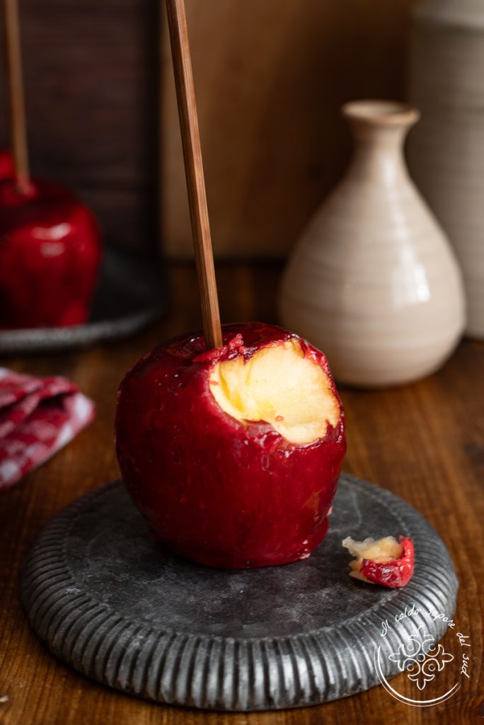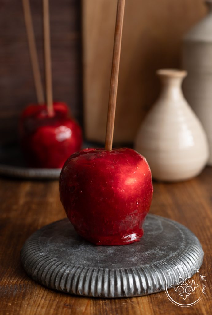 Pomme ensorcelée, la recette de la pomme caramélisée à l’américaine ou la recette de la célèbre pomme de Blanche-Neige. Recouverte d’un caramel rouge brillant, belles à voir et irrésistibles à croquer, les pommes ensorcelées sont l’un des desserts aux pommes les plus amusants à réaliser. Un dessert automnal dédié à la fête américaine d’Halloween et que, pour une fois, je veux aussi rappeler, avec les Dolci dei morti, les douceurs italiennes traditionnelles du 1er novembre. Brillantes, juteuses, grosses et appétissantes, les pommes ensorcelées ou caramélisées sont belles à regarder et délicieuses à manger, elles rendent les enfants heureux et apportent de la gaieté à la maison ! Aujourd’hui on les prépare ensemble, mais attention à la température du sucre !!