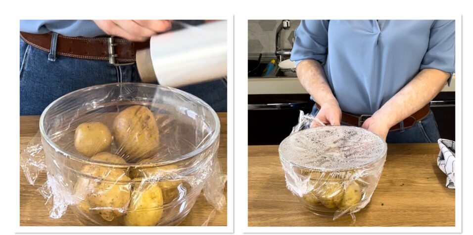 Placez les pommes de terre dans une casserole, couvrez d’eau, ajoutez du sel et faites cuire 35–40 minutes après l’ébullition ou jusqu’à ce qu’un cure-dent les traverse facilement. Égouttez-les et laissez-les refroidir délicatement à température ambiante. Ou faites comme moi : mettez-les dans un bol après les avoir lavées, versez un demi-verre d’eau et couvrez hermétiquement avec du film. Faites cuire au micro-ondes à 750 W pendant 20 minutes, puis sortez-les et laissez tiédir quelques minutes.