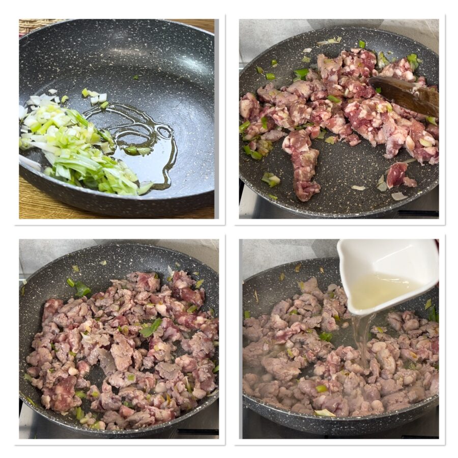 Hachez les oignons nouveaux ou l’oignon, laissez-les fondre puis ajoutez la saucisse débarrassée de sa peau et émiettée. Laissez cuire à feu vif et quand elle aura changé de couleur en devenant plus claire, déglacez avec le vin blanc et attendez qu’il évapore avant d’éteindre le feu.