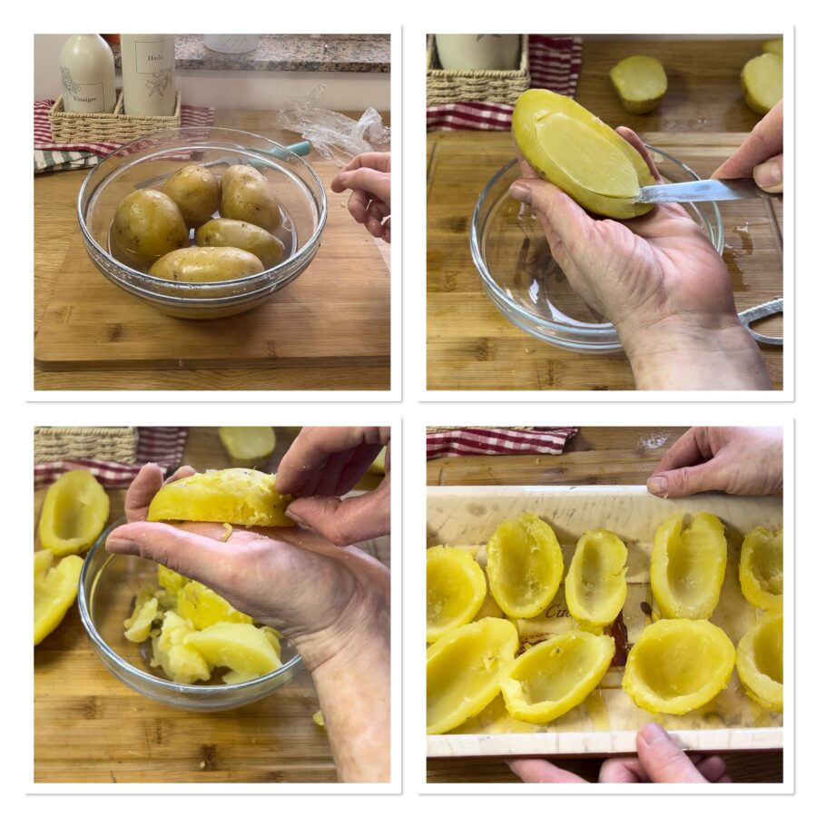 Reprenez les pommes de terre, elles devraient être presque à température ambiante ou juste un peu chaudes : coupez-les en deux, mais ne retirez pas encore la peau. Incisez-les sur les côtés avec un couteau et évidez-les délicatement avec une cuillère en mettant de côté l’intérieur, puis, avec la même délicatesse et seulement maintenant si vous le souhaitez, vous pouvez les peler.