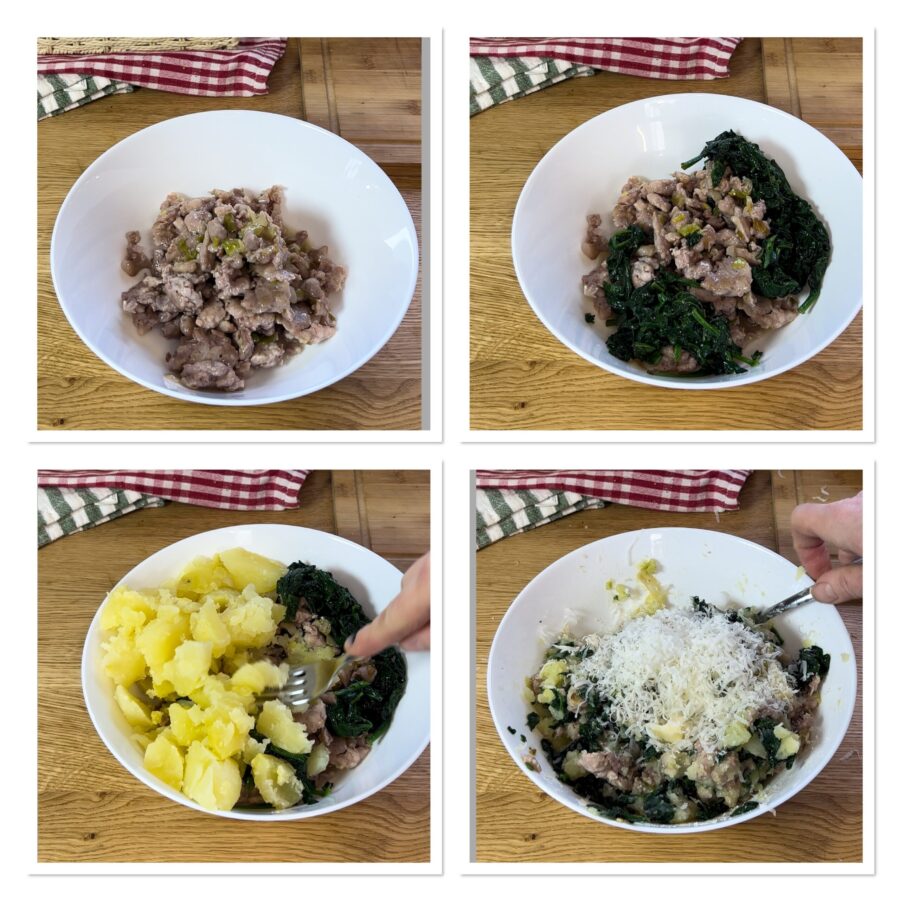 Mélangez la saucisse avec les épinards, la chair des pommes de terre et le fromage râpé.