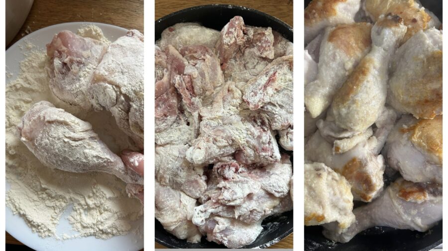 Pour préparer le poulet à la cacciatora en blanc, commencez par portionner la viande, puis passez-la dans la farine afin qu’elle adhère bien ; ne retirez pas la peau. Chauffez une grande poêle à fond épais et déposez-y la viande; laissez bien dorer (il n’est pas nécessaire d’ajouter de l’huile) les morceaux de poulet, jusqu’à ce qu’ils soient bien dorés et aient une croûte consistante, cela prendra environ 15 à 20 minutes.