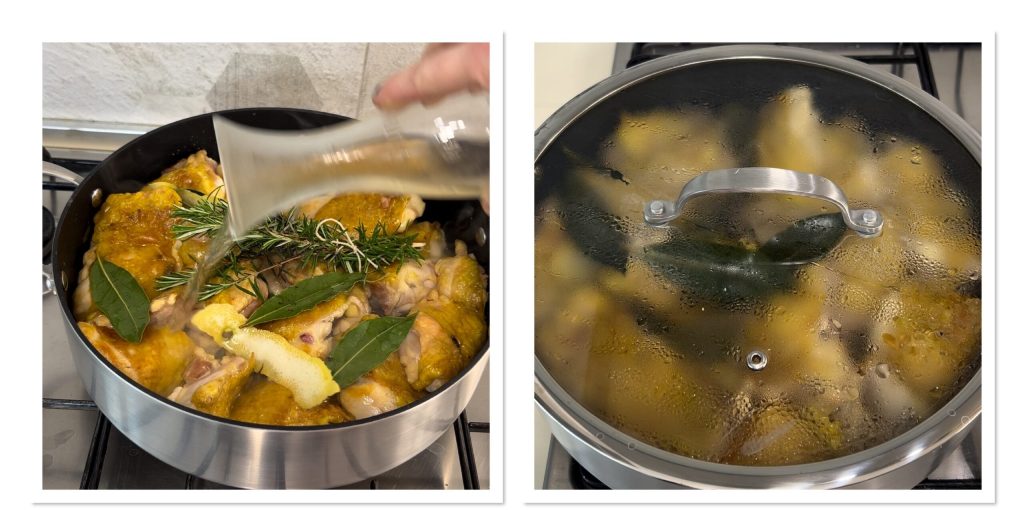 Retournez la viande, ajoutez les brins de romarin, le zeste de citron prélevé avec un économe et le laurier, faites cuire à feu vif pendant 10 minutes, puis déglacez avec le vin et, une fois évaporé, baissez le feu et couvrez la casserole.