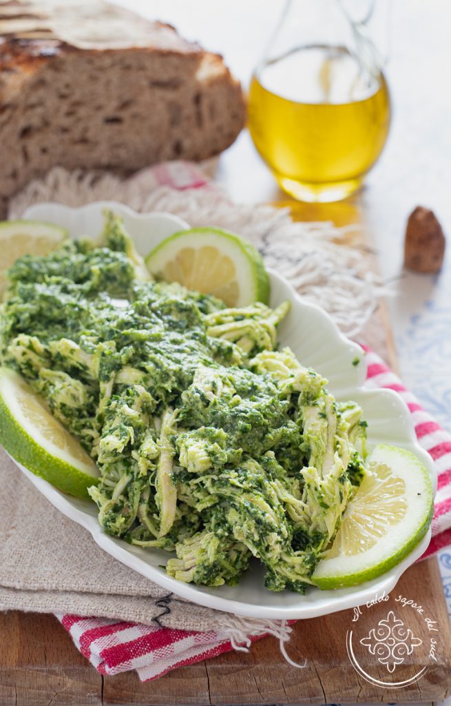 Aujourd’hui nous la préparons ensemble, en cuisinant une recette d’été avec du blanc de poulet, très gourmande et légère, qui deviendra l’un de vos plats uniques estivaux préférés. Et si vous ne savez pas comment cuire le poulet, cette recette vous facilitera la tâche. En été, je prépare souvent des salades avec du blanc de poulet comme l’insalata di pollo con verdure ou l’insalata de poulet aux poivrons rôtis, des recettes simples qui transforment cette viande en préparations vraiment savoureuses et satisfaisantes. Aujourd’hui, par exemple, après avoir préparé un blanc de poulet bouilli, je l’ai effiloché et rapidement enrichi avec le sauce verte piémontaise et j’ai obtenu un plat principal simple et rapide délicieux. Si vous voulez préparer vous aussi cette salade de poulet gourmande avec sauce verte, suivez-moi en cuisine : je suis sûre qu’elle vous séduira. Avant cela, je vous recommande de jeter un œil à notre recueil de recettes estivales rapides et si vous souhaitez rester informé(e) de toutes mes recettes, vous pouvez suivre ma page Facebook (ici) et mon profil Instagram (ici) ! Le poulet en sauce verte se prépare en faisant bouillir les blancs de poulet avec des légumes et des aromates pour les parfumer. Les blancs bouillis sont ensuite assaisonnés d’une savoureuse sauce préparée avec du persil, du basilic, de l’ail, des câpres et des olives.