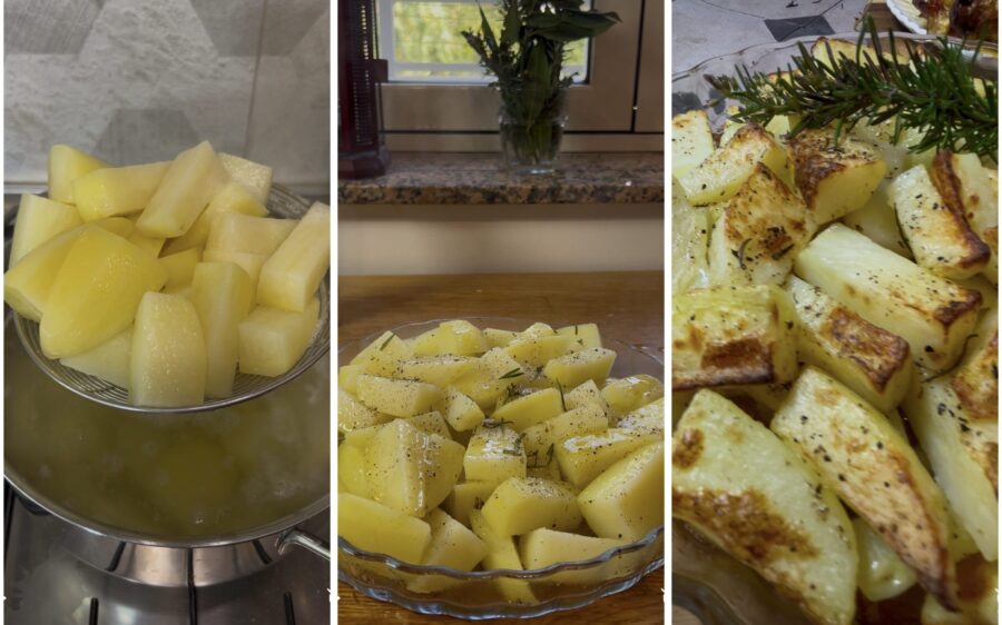 Égouttez-les, mettez-les dans un plat, assaisonnez généreusement d’huile, de sel, de poivre et de romarin. Une fois le poulet sorti du four et maintenu au chaud, faites cuire les pommes de terre à 230°C pendant environ 20 minutes.
