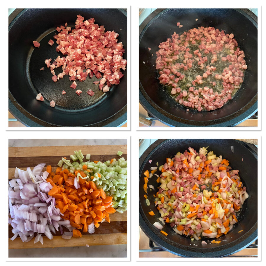 Mettez la pancetta douce coupée en dés dans la casserole, et laissez fondre sa graisse doucement à feu très doux. Ajoutez l’huile ou le beurre et, pendant que la pancetta dore, coupez les carottes, l’oignon et le céleri en tous petits dés.