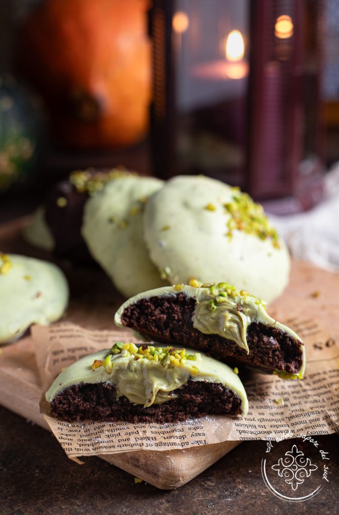 • Une fois la préparation terminée, occupez-vous du chocolat. Si vous voulez garnir les rame de Naples avec de la crème au pistache, comme je l’ai fait, ou avec de la Nutella, dès que les rame sont froides creusez un puits au centre de chacune, mais sans percer jusqu’au fond. Versez dans chaque trou de la crème à tartiner et placez au congélateur pendant 20 minutes.