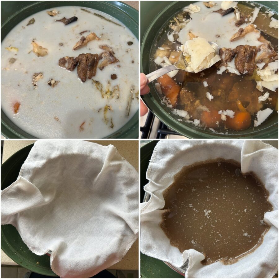 À ce stade, éteignez le feu et laissez reposer le bouillon toute une nuit. Dans les mois les plus froids, vous pouvez le laisser à température ambiante ; en été, une fois refroidi, transférez-le au réfrigérateur.