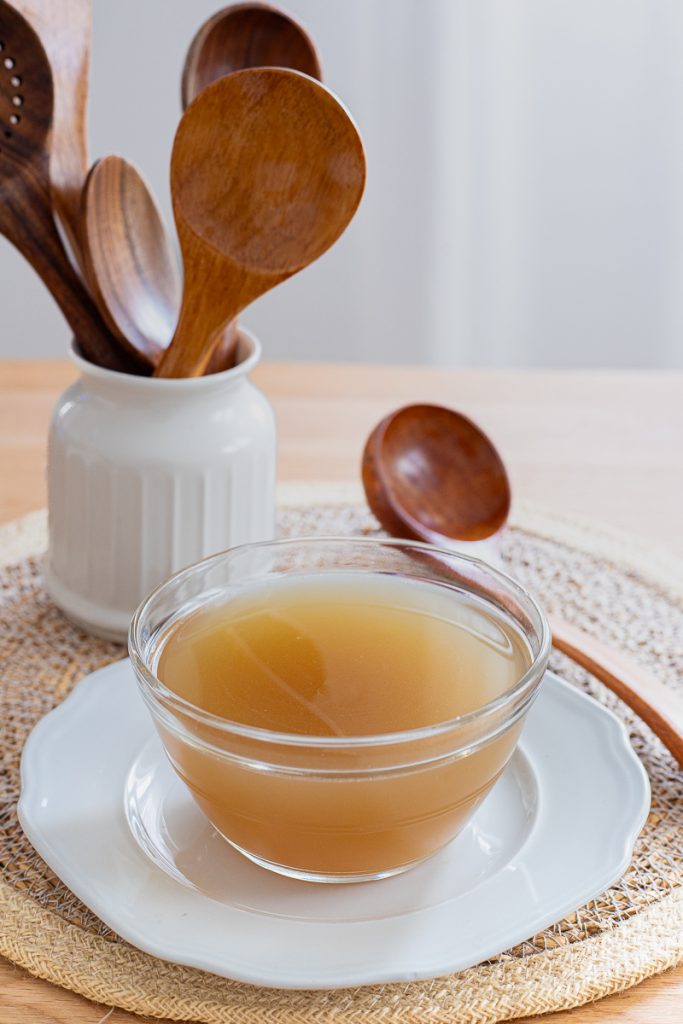 Une fois refroidi, vous remarquerez que le bouillon a tendance à devenir gélatineux : c’est tout à fait normal et c’est le signe de la présence naturelle de collagène. Il suffit de le réchauffer légèrement pour qu’il redevienne liquide.