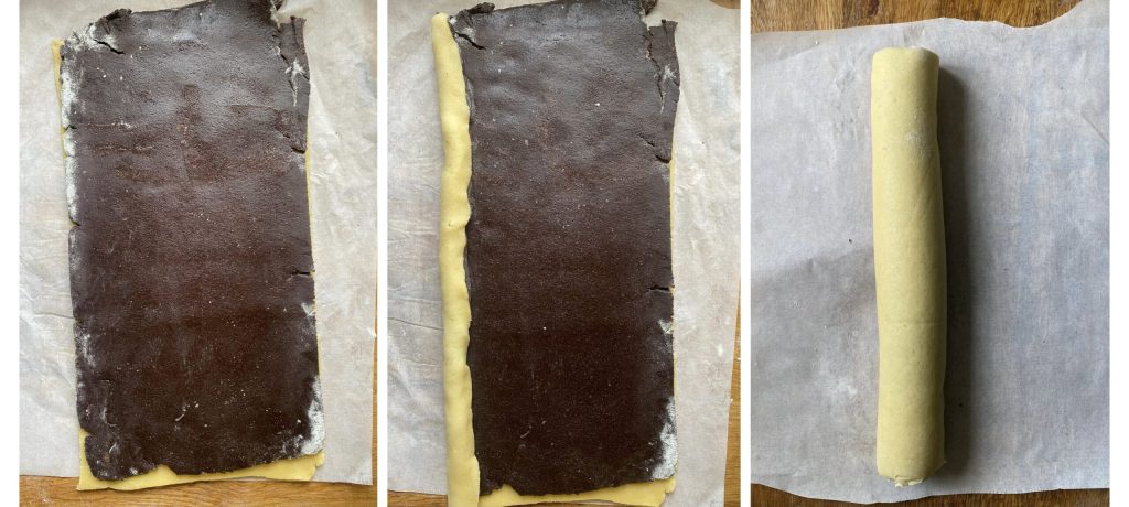 • Après 30–40 minutes, sortez les pâtes du frigo. Commencez par étaler la moitié blanche en un rectangle d’environ 3 mm d’épaisseur.