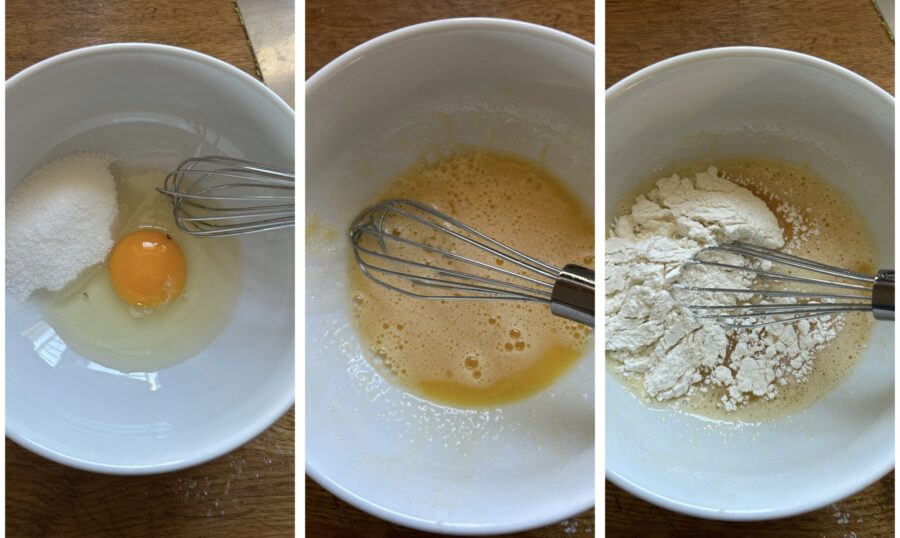 Une fois la pâte d’amande prête, occupez-vous de la génoise : pour la quantité indiquée, cela ira vite. Dans un bol, mettez un gros œuf et 30 g de sucre, travaillez rapidement puis ajoutez la farine ; mélangez encore avec le fouet en essayant d’incorporer de l’air, ajoutez la levure et homogénéisez, versez le mélange dans un petit moule,