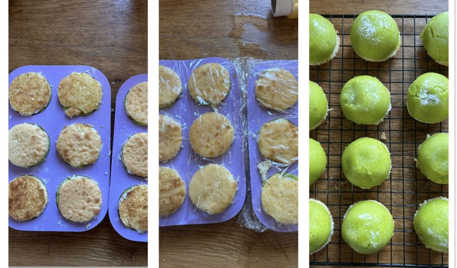 et enfournez à 180°C pendant environ 7 minutes ; faites le test du cure-dent et sortez du four. Détourez au moins six disques du diamètre de vos moules (les miens 5 cm), puis coupez-les en deux et réservez (vous devrez obtenir au final au moins 12 disques).