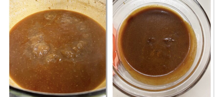 • Remettez sur le feu, rectifiez l’assaisonnement si nécessaire et laissez réduire encore à feu modéré, jusqu’à obtenir une consistance dense et ambrée.