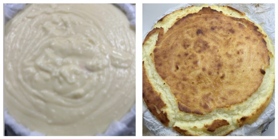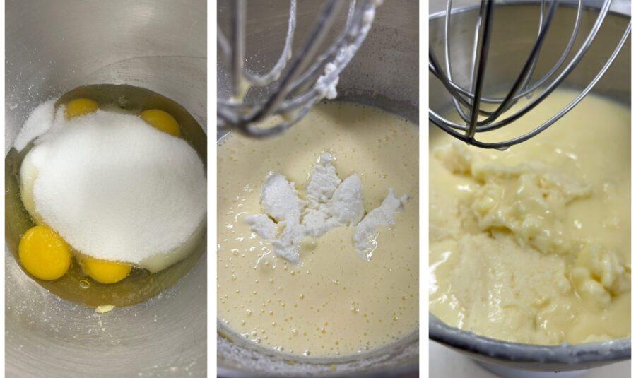 Battez les œufs avec le sucre ; lorsque le mélange devient mousseux, ajoutez la ricotta bien égouttée (au moins 24 h). Une fois incorporée, ajoutez également la semoule et mélangez jusqu’à homogénéité.