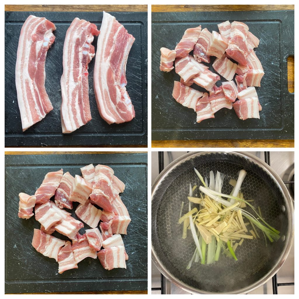 • Pour préparer le Hongshao rou, commencez par couper la poitrine en bandes d’environ 4 cm de large. Mettez sur le feu une poêle remplie d’eau et pendant qu’elle commence à bouillir, coupez un oignon nouveau et quelques tranches de gingembre.
