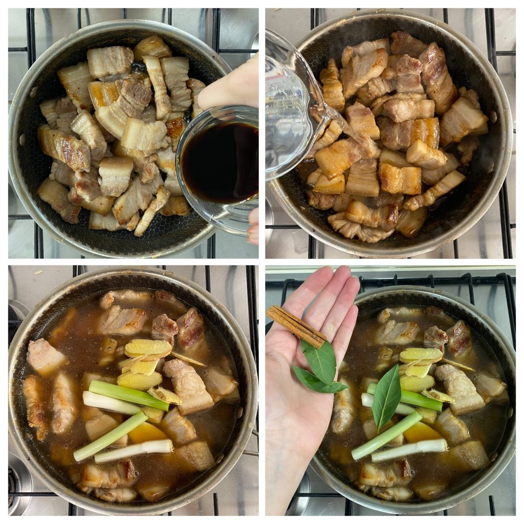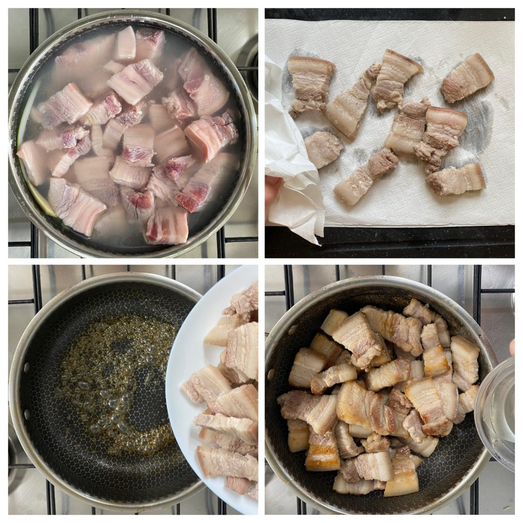 • Plongez le porc dans l’eau bouillante avec le gingembre et l’oignon nouveau pendant 10 minutes, puis réservez le bouillon et séchez les bandes de poitrine avec du papier absorbant. Dans la même poêle, ajoutez 20 ml d’eau et le sucre de canne, laissez fondre et caraméliser le sucre. Ensuite, ajoutez la poitrine et faites-la dorer pendant 1-2 minutes, puis ajoutez le vin blanc.