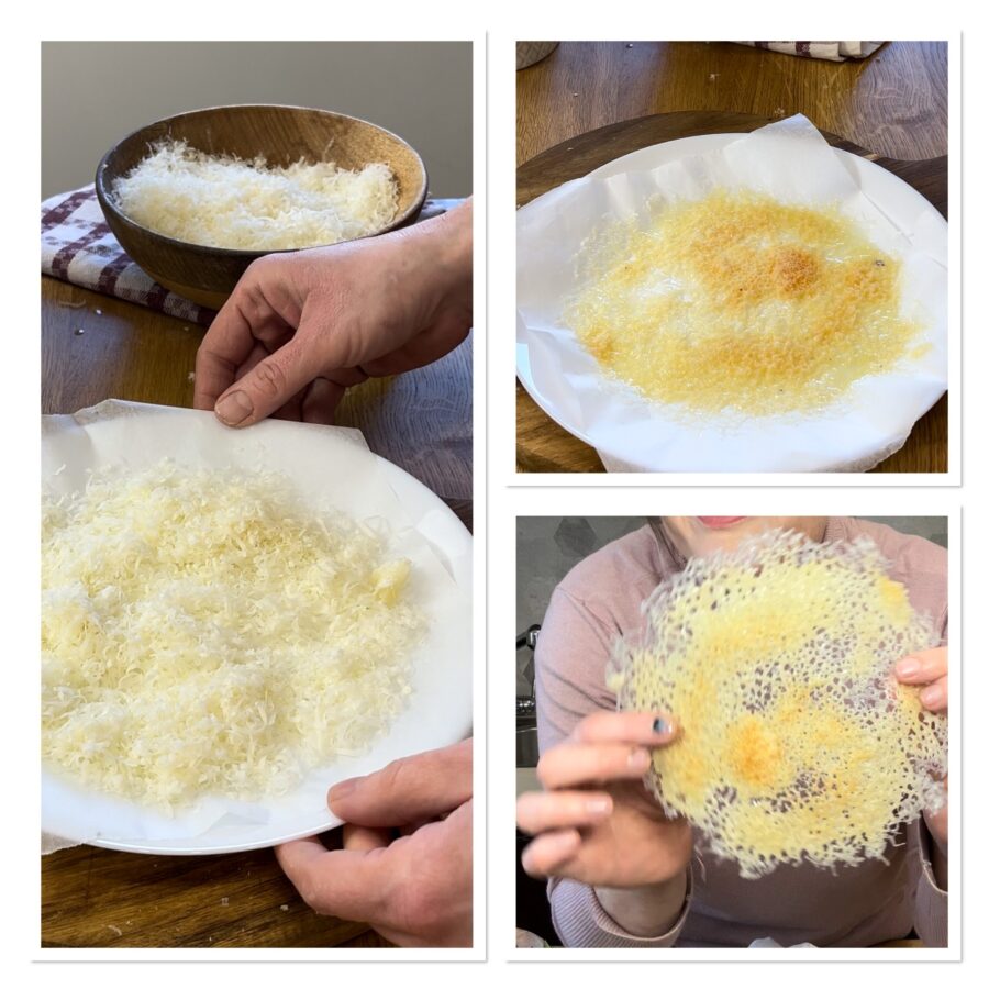 Pour décorer votre assiette, réalisez des tuiles de fromage. Disposez une feuille de papier cuisson sur une assiette, répartissez dessus une poignée des deux fromages râpés et passez 40 s au micro-ondes, sortez et si le fromage a pris de la couleur, laissez refroidir, sinon prolongez encore quelques secondes. La tuile refroidie pourra être cassée et utilisée pour garnir le plat.