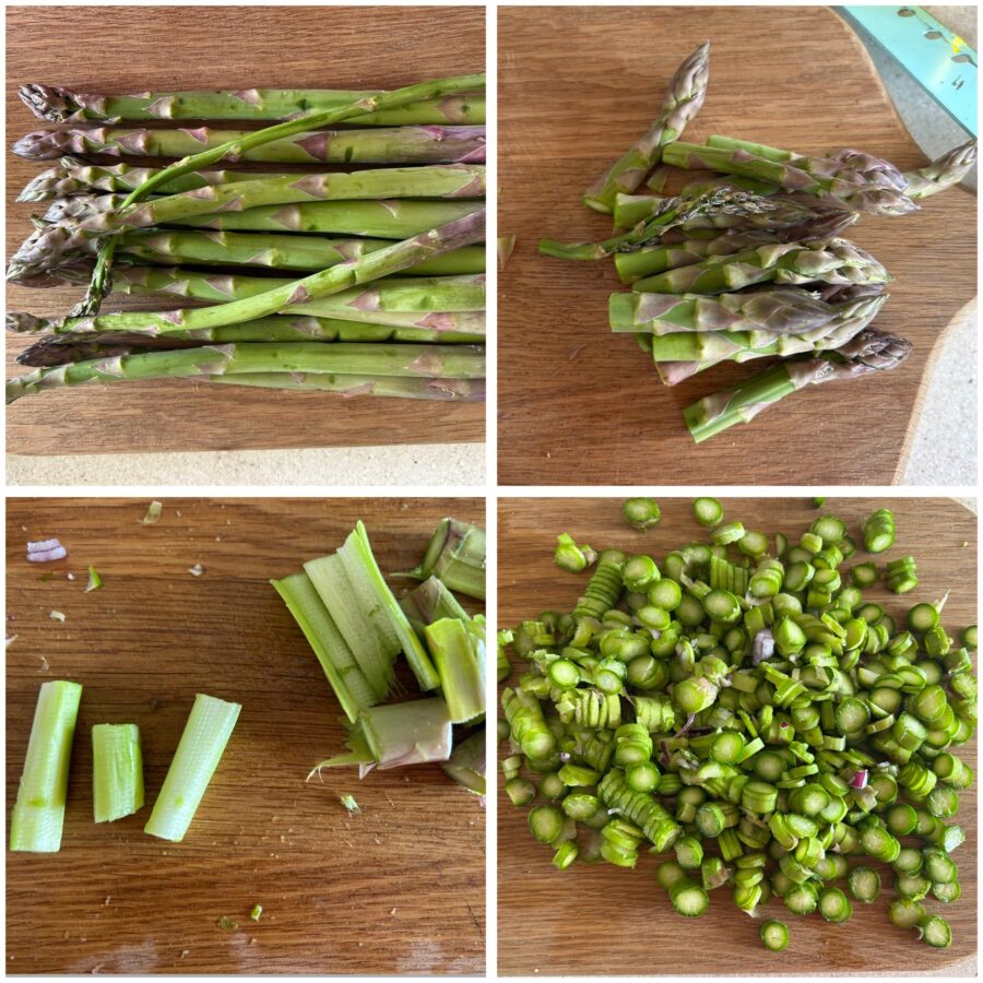 Enlevez la partie finale la plus dure de la base, épluchez la partie la plus coriace pour éviter le gaspillage et coupez le reste en rondelles. Les pointes doivent être mises de côté et ajoutées presque en fin de cuisson pour garder leur goût et leur texture.