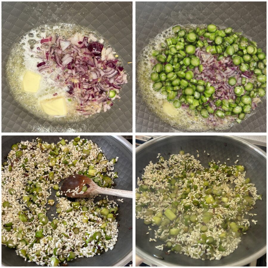 • Faites revenir et laissez fondre l’échalote, pelée et hachée, dans le beurre. Ajoutez les asperges en rondelles et faites-les parfumer avec une pincée de sel, puis réservez la moitié de ce soffritto et versez le riz dans la casserole. Mélangez avec le reste des ingrédients et laissez cuire deux minutes en remuant souvent.