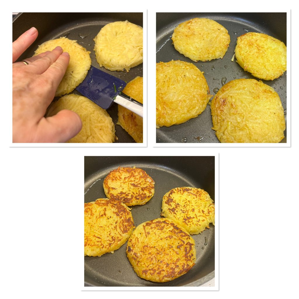 Laissez frire les rösti à feu moyen pendant 9 minutes, puis augmentez la flamme et poursuivez la cuisson pendant une minute.