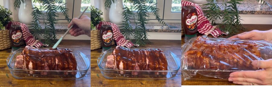 Placez la viande dans un contenant spacieux, versez presque toute la sauce barbecue et badigeonnez-la généreusement. Couvrez de film alimentaire et laissez mariner 8 à 12 heures au réfrigérateur.