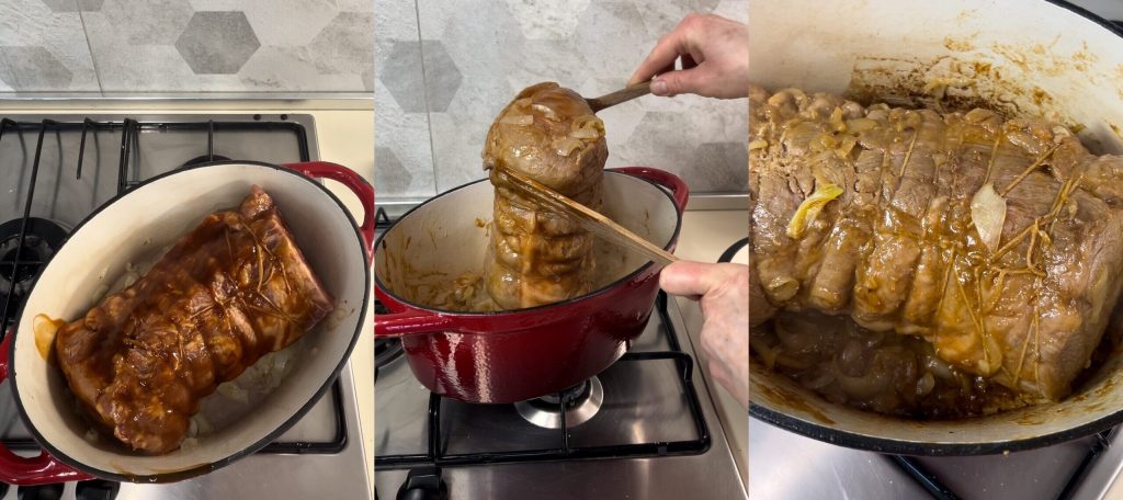 Versez un demi-verre d’eau, baissez le feu et faites cuire sur la plaque la plus petite, à feu très doux pendant 2 heures, en retournant de temps en temps (il ne devrait pas être nécessaire d’ajouter d’eau). Comptez environ 1 heure de cuisson par kilogramme de viande.