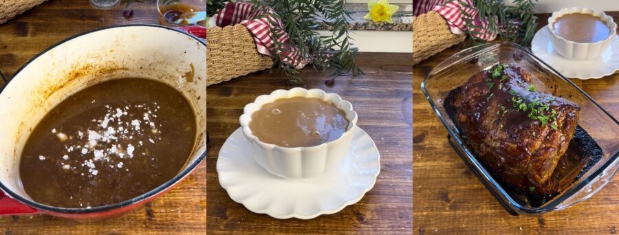 Pendant que le rôti termine la cuisson, récupérez le jus de cuisson, ajoutez 1 cuillère à café de fécule de maïs et remettez sur la plaque, laissez épaissir et, si vous le souhaitez, mixez la sauce.