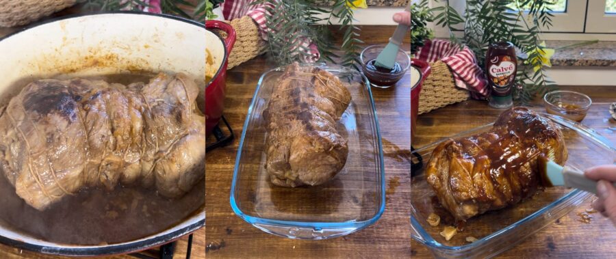 Après environ 2 heures de cuisson, ou un peu plus, transférez le rôti dans un plat allant au four et badigeonnez-le généreusement avec de la sauce barbecue prélevée du total (environ 60 g). Mettez au four et faites cuire encore 20 minutes à 200 °C, en badigeonnant de temps en temps avec de la sauce.