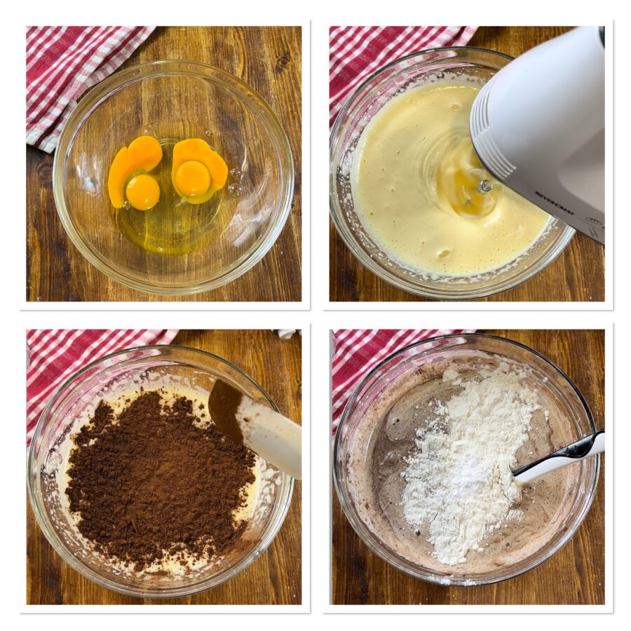 Mettez le batteur de côté et, à l’aide de la spatule, incorporez le cacao et la farine en plusieurs fois, en effectuant des mouvements délicats du bas vers le haut et en faisant attention à ne pas faire retomber le mélange.