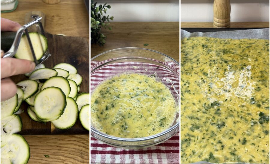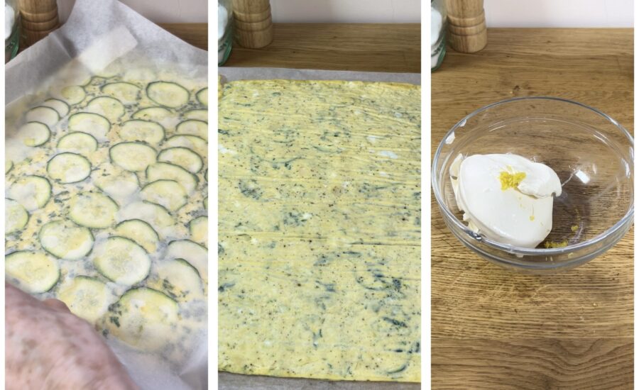 Tranchez les courgettes avec un épluche-légumes ou une mandoline, elles doivent être très fines. Versez le mélange sur une plaque rectangulaire (environ 35×40) recouverte de papier sulfurisé et disposez les tranches de courgette de façon ordonnée par-dessus.