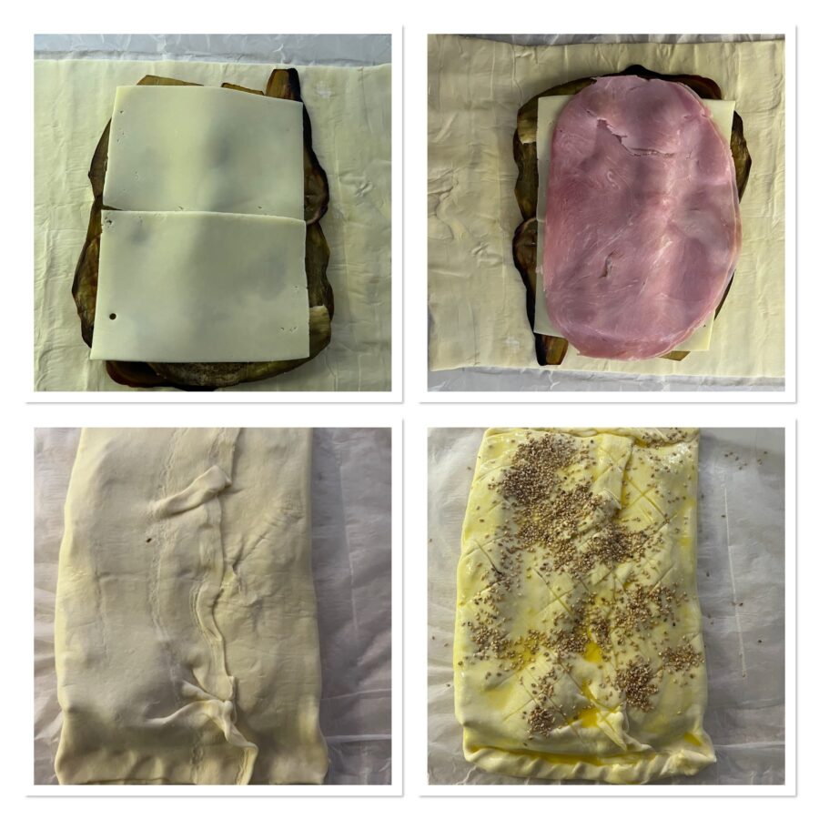 • Déroulez la pâte feuilletée, disposez les aubergines en laissant libre le bord pour rabattre, couvrez avec un fromage qui fond bien et le jambon.
