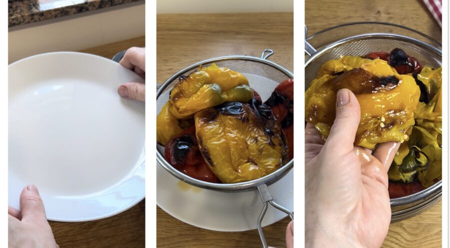 Quand les poivrons seront bien cuits, comptez environ 35-40 minutes : mettez-les délicatement dans un saladier et couvrez-les ; laissez reposer au moins 20-25 minutes.