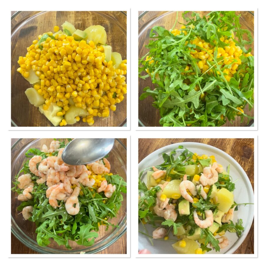 Ajoutez l’avocat, le maïs, la roquette et les crevettes aux pommes de terre, rectifiez l’assaisonnement en sel et en huile, versez le jus de citron. Mélangez et servez.