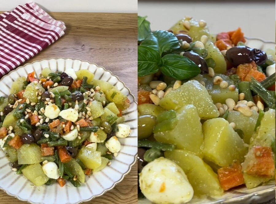 Salade de pommes de terre et haricots verts avec pesto, mozzarella et olives. Fraîche, gourmande et consistante, quand il fait chaud voilà l’insalata de pommes de terre, haricots verts et mozzarella ! J’adore les salades de pommes de terre originales, de la salade de pommes de terre au thon avec œufs durs à la classique salade de pommes de terre des îles Éoliennes, sans oublier la salade de pommes de terre au saumon fumé : une salade de pommes de terre riche et nourrissante sauve toujours le dîner et ravit tout le monde ! Certainement reines des salades d’été et des plats uniques frais et légers, les salades de pommes de terre sont la solution quand on veut rester léger sans sacrifier le goût. Parfaites pour le panier-repas, les pique-niques, les journées à la plage et se préparent aussi à l’avance pour être dégustées tranquillement après une longue journée dehors. Cette recette est très facile, économique et délicieuse : elle se sert froide sortie du frigo ou à température ambiante et peut être un plat unique complet et léger. Allez, en cuisine, préparons-la ensemble et vous verrez comme c’est bon ! Avant de commencer, je vous rappelle que si vous voulez rester informés de toutes mes recettes, vous pouvez suivre ma page Facebook (ici) et mon profil Instagram (ici).