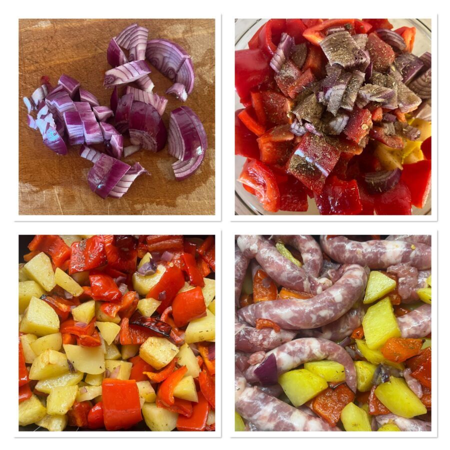 Saucisse aux poivrons, pommes de terre et oignon au four ou à la friteuse à air, un plat principal estival à base de poivrons, facile et délicieux, idée parfaite pour un dîner en famille ou entre amis.