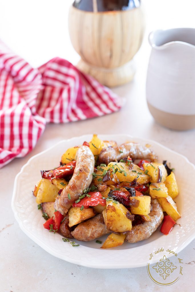 Saucisse avec pommes de terre, poivrons et oignons, une combinaison parfaite pour un plat principal rustique délicieux : vous ne trouvez pas ? Quand je le prépare chez moi c’est toujours la fête, mon mari et mes enfants en raffolent et donc en été je le cuisine assez souvent pour le dîner. Je prépare la saucisse avec les poivrons et les pommes de terre au four, mais quand il fait particulièrement chaud, je préfère utiliser la friteuse à air, que je place sur la terrasse pour éviter de trop chauffer ma cuisine. La préparation est quasiment identique à celle du four traditionnel et le résultat est tout aussi délicieux. Si vous voulez préparer ce plat vous aussi, suivez-moi en cuisine, je vous dirai comment faire et si vous souhaitez rester informé(e) de toutes mes recettes, vous pouvez suivre ma page Facebook (ici) et mon profil Instagram (ici).