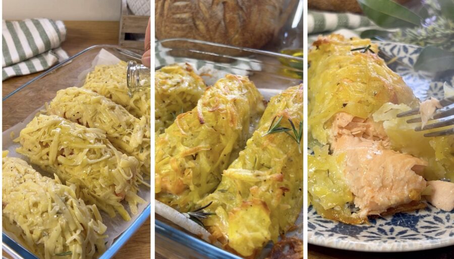 Aujourd’hui je veux vous expliquer comment le préparer au four, enveloppé d’une délicieuse croûte de pommes de terre au romarin, une recette super simple qui vous fera bien paraître même pendant les fêtes ! Le saumon en croûte de pommes de terre reste moelleux et juteux, et le résultat est un plat de poisson riche et savoureux.