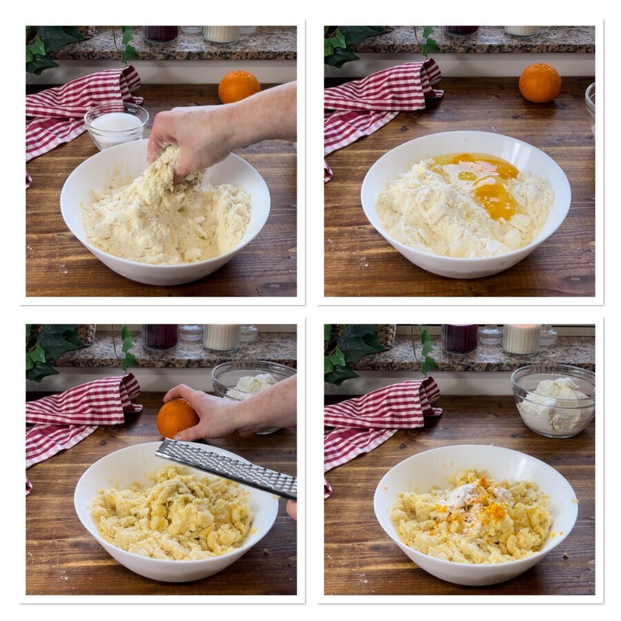 Ajoutez le sucre, les oeufs et pétrissez rapidement. Ajoutez le zeste d’orange et la levure puis reprenez à travailler grossièrement avec la main, jusqu’à ce que vous voyiez se former des miettes de différentes tailles. La pâte est prête, ne continuez pas plus sinon le beurre fondra et vous obtiendrez une pâte sablée classique.