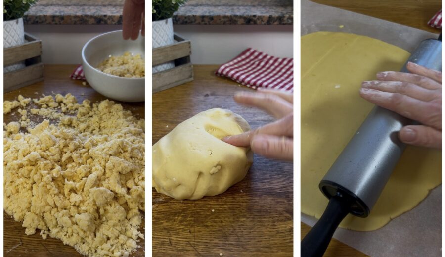 Mettez de côté 300 g de miettes de pâte sablée et pétrissez le reste rapidement jusqu’à obtenir une pâte homogène ; soyez rapides pour ne pas trop chauffer la pâte. Laissez-la reposer 20 minutes au réfrigérateur, couverte de film alimentaire, puis étalez-la sur une feuille de papier cuisson farinée en formant une grande abaisse d’environ 0,5 cm d’épaisseur.