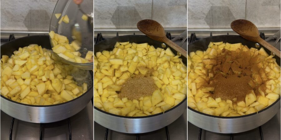 ajoutez les pommes, le sucre de canne et la cannelle, mélangez et faites cuire au moins 20 minutes à feu moyen.