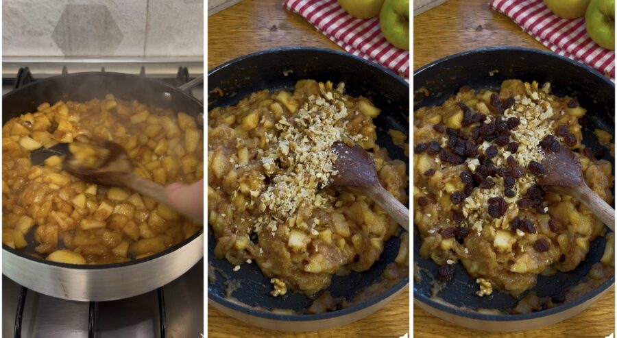 Les pommes doivent être presque défaites et assez sèches ; ajoutez alors 40 g de noix hachées au couteau prélevées du total, ainsi que les raisins secs. Laissez reposer et refroidir la préparation.